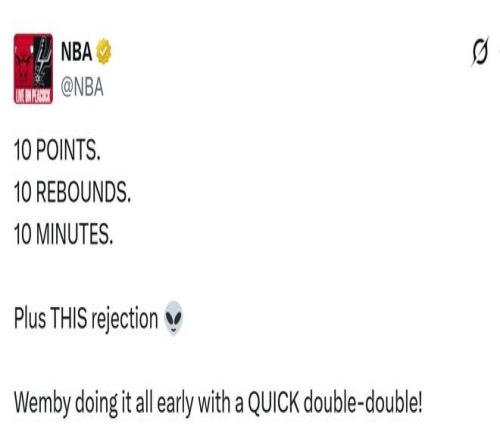 此役,文班亚马还创下了两大NBA历史第1的神迹。第1、NBA官方数据统计显示,文班亚马仅用8分40秒(首节上场6分05秒后被换下、最后40秒上场;次节上场1分55秒得到第10板)的上场时间就得到两双数据(10分10板),创NBA历史最快纪录。