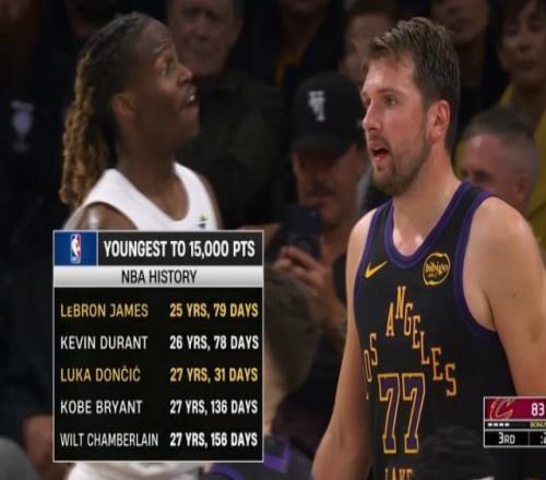 27岁31天的东契奇超越了科比的27岁136天拿到15000分,成为NBA历史上第三年轻的15000分先生,仅次于詹姆斯(25岁79天)和杜兰特(26岁78天)。