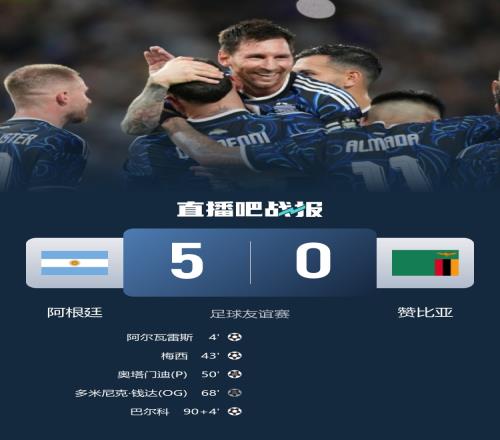下半场补时3分钟,阿根廷5-0赞比亚。