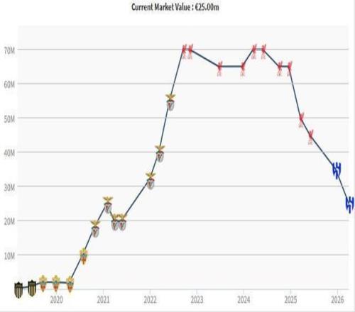 而作为对比,2024年效力于利物浦的努涅斯巅峰身价为7000万欧元,仅仅两年时间身价下跌了4500万欧元,降幅可谓非常之大。