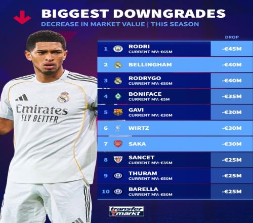本赛季身价下跌TOP10:罗德里、贝林前二,维尔茨、萨卡降3000万