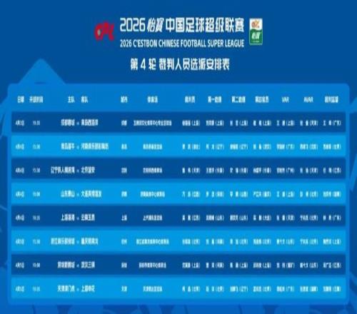 北京时间4月3日,在经历间歇期之后,2026赛季中超联赛将于今晚重燃战火,迎来第4轮的比赛。在中国足协公布的第4轮裁判选派安排表中,王迪、戴弋戈各担任2场比赛的VAR引发了关注。